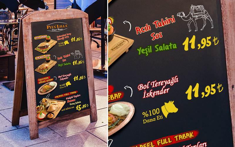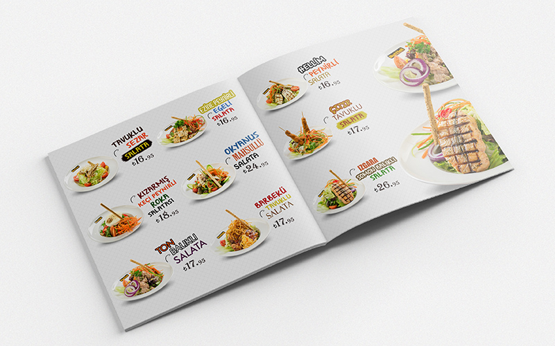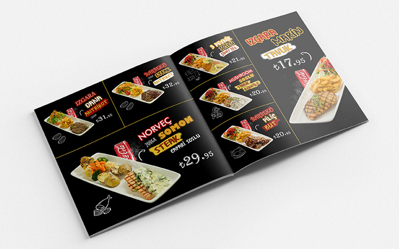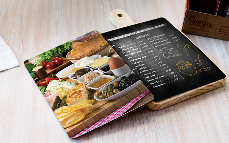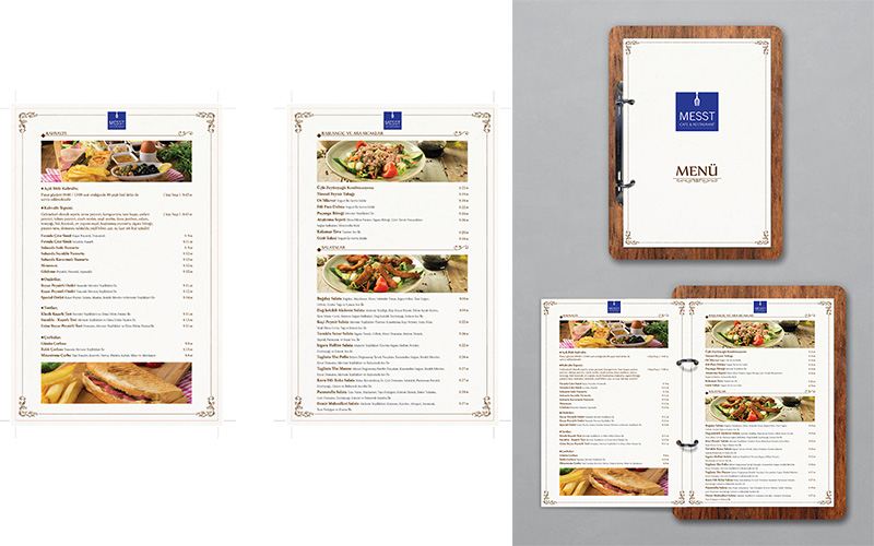 Pastane, kafe, restaurant gibi işletmelerin masa müşterilerine sunacağı mini bir vitrindir menüler... Ürünlerin profesyonel konsept veya dekupe görselleriyle hazırlanmış bu menüler müşteride iştah açıcı bir his uyandırmalıdır. Lezzetler hakkında müşterinin kısa dipnotlar ile bilgilendirilmesi markayı daha bilinçli kılacaktır. Peki menü tasarımı nasıl olmalıdır? Menü, markanın kurumsal konseptine (renkler, dekorlar, çizgiler) uygun olmalıdır. Menüde kullanılacak ürün fotoğrafları menü için özel çekilmiş ve profesyonel kalitede olmalı. Müşteriden, "Ama bu, benim menüde gördüğüm gibi değil" cümlesi kesinlikle duyulmamalı ve bu yüzden hazır, stok veya çalıntı görseller kullanılmamalıdır. Şık, aynı zamanda sade, göz yormayan, bilgilendirici bir tasarıma sahip olmalıdır.